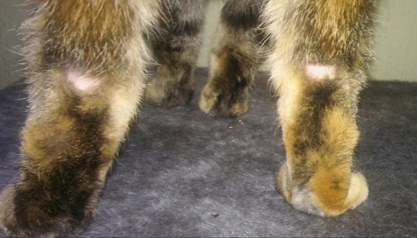 Tengo una gata de 2 años y medio (vacunada y castrada). Está bien alimentada y la gata se la ve contenta y juguetona. Desde hace unos 6 meses le han salido 2 calvas pequeñas, 1 en cada articulación de las patas traseras, la piel se le ve blanquita, no tiene ninguna rojez o granitos. ¿Qué puede ser? ¿Debo preocuparme?
