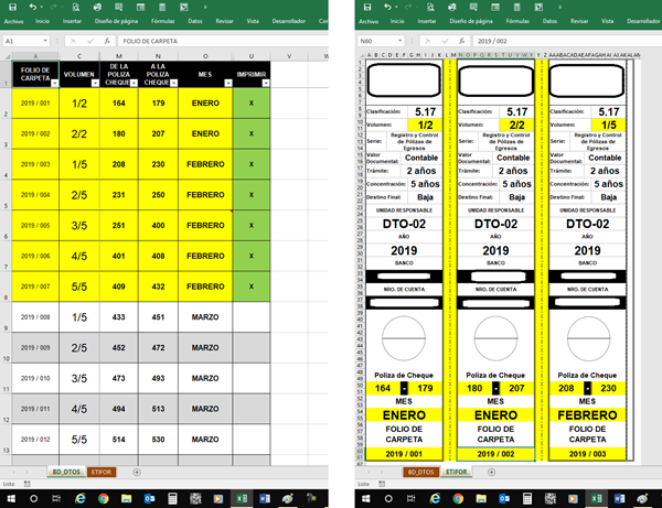 Ya eh hecho varias preguntas, y en verdad he quedado muy satisfecho, de ellas la verdad eh ajustado las macros que me han regalado a mis necesidades, ahora tengo realmente un reto importante, resulta que tengo una base de datos, en la que capturo información y que necesito se vacié a una pre-forma de etiqueta y que se imprima cambiando los datos de tres en tres, y hasta que en la columna "impresión" ya no este una "x", le anexo una imagen de las dos hojas que les comento, y agradezco de antemano su colaboración, verán en amarillo están seleccionados los datos que quiero se coloquen en la etiqueta (hoja de la derecha) y en la columna en color verde la "x", la base de datos tiene mas datos por lo que las etiquetas se imprimirán tantas "x"'s haya en la columna imprimir