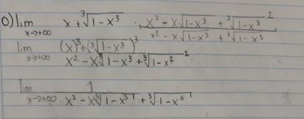 $$\begin{align}&\lim _{x\to \infty }\left(x+\sqrt[3]{1-x^3}\right) resultado =0\end{align}$$De esta manera lo intento solucionar pero no se que mas hacer nota: no se puede hacer uso de L-hopital: