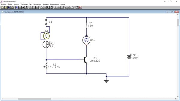 La idea es que al encenderse la bombilla mediante switch disminuya la resistencia de la fotocelda para que fluya la corriente hasta la base del transistor y salga por el colector para que accione el motor. La cuestión es que no veo el el motor se accione de ningún modo, es un motor animado. Considero que el circuito está correcto, no encontré una fotocelda que trajera la bombilla integrada o tal vez esté ejecutando mal la simulación. Agradezco mucho si me pudieran indicar si a simple vista ven algo mal del circuito o si hay que tener en cuenta ciertas cosas para ejecutar correctamente la simulación.