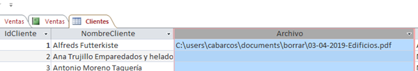 Documentos (Id, Descripción, Archivos, Fecha) y la otra Edificios (Id, Zona, Ubicación), tengo el código para al darle imprimir me genere un documento PDF de los edificios que tengo en la tabla ubicándolo en una carpeta de la base de datos, lo que no consigo es ese archivo introducirlo en la tabla documentos, supongo que primero tiene que localizarlo que la ruta del archivo