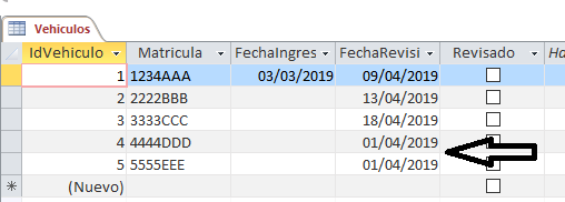 Esta consulta selecciona los vehículos cuya fecha de reparación sea 2 días siguientes a la fecha del sistema y es el origen de datos del formulario elegidos.