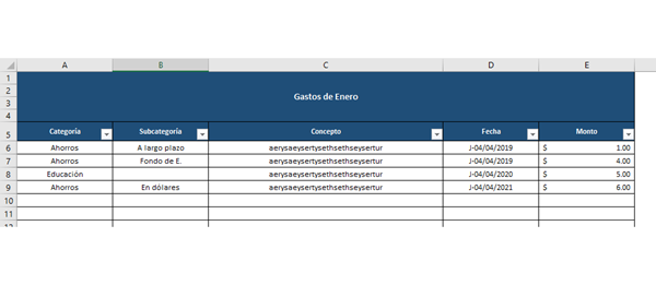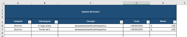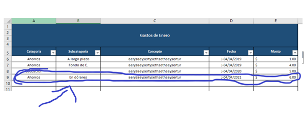 Si yo tengo mi tabla configurada de esa manera y en subcategoría pongo "En dólares", en TOTAL debería de darme la suma de $6.00, porque fue el único gasto de categoría ahorros, con subcategoría "En dólares" en enero... Eso es lo que necesito...