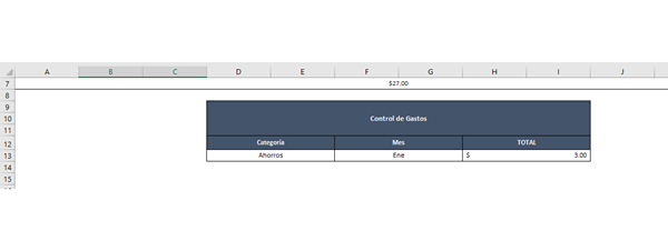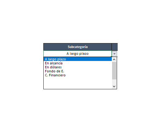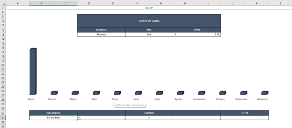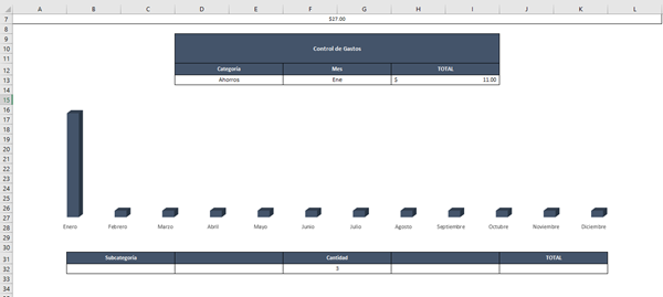 Cuando yo seleccione una de esas subcategorías de "Ahorros", en la celda J32 me dará el resultado de la suma de los gastos que hice con categorías "Ahorros" y con la subcategoría que yo seleccione en dicha lista desplegable (LA CELDA DE DICHA LISTA ES LA B32).