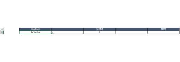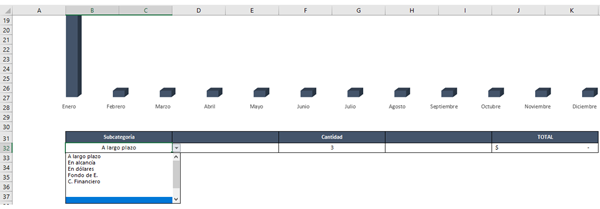-Una vez tenga la categoría, el mes, y la subcategoría seleccionada, en la celda J32 me hará una suma tomando en cuenta SOLO LA SUBCATEGORÍA QUE SELECCIONE Y EL MES.