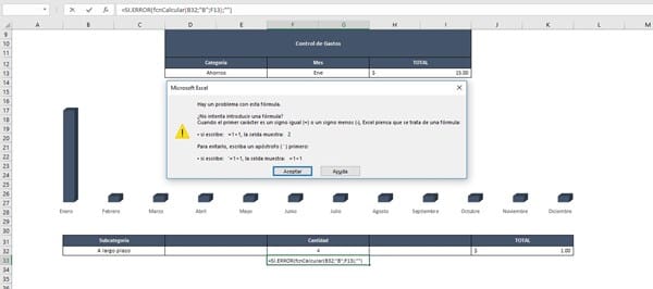 Donde: B32 contiene la subcategoría buscada, "B" es la columna de cada mes en que se buscará la subcategoría, F13 contiene el més por el que vamos a preguntar y "SUM" le indica que lo que quieres es sumar. Si B32 está vacía, la función entregará un error, por lo que la función SI. ERROR hará que J32 quede vacía. - F32 no la mencionas, pero según veo, debiera tener la cuenta de las subcategorías según el mes seleccionado (esta cuenta es independiente de la categoría seleccionada), entonces es la 3° funcionalidad, por lo tanto, en la celda F32 debiera ir lo siguiente
