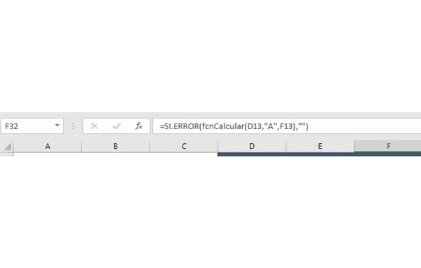 =SI.ERROR(fcnCalcular(D13;"A";F13);"") - Observar que los puntos 3 y 4 son excluyentes, se usa uno o el otro.