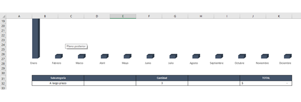 Donde: D13 contiene la categoría, "A" es la columna de cada mes en que buscaremos esa categoría, F13 contiene el mes por el que vamos a preguntar y "SUM" le infica que sume. - En J32 tienes la suma de las subcategorías según el mes seleccionado (esta suma es independiente de la categoría seleccionada), que es la 4° funcionalidad, por lo tanto, en la J32 debiera ir lo siguiente