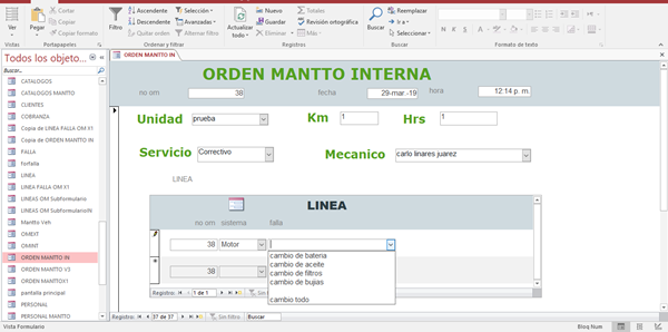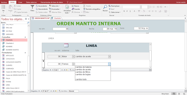Hice un formulario para capturar datos y generar una orden de mantenimiento, tiene un subformulario para que se vayan registrado por linea cada una de las reparaciones que necesita la unidad, este subformulario tiene 2 cuadro combinados uno esta ligado a una tabla que son los sistemas de la unidad ejemplo: motor, electrico, suspension etc., y otro a una consulta la cual al seleccionar el sistema en el primer cuadro combinado muestra las reparaciones que tiene cargadas, el problema que tengo es que solo en la primera linea lo hace en las siguientes si cambia el sistema pero no las reparaciones.