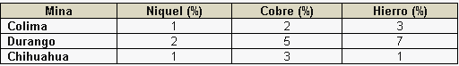 Una empresa dedicada a la exportación de metales, cuenta con tres minas ubicadas en el interior de la República Mexicana: Colima, Durango y Chihuahua, está realizando un inventario del cual obtuvo la siguiente tabla de metales y composiciones: