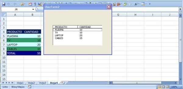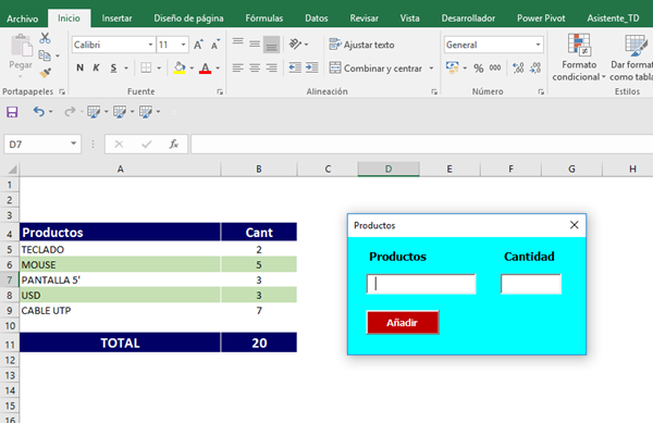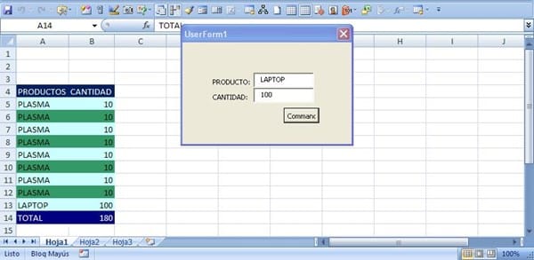 Private Sub Registrar_Click() Sheets("Productos").Select Range("A2").Select Application.GoTo Reference:="R65000C1" Selection.End(xlUp).Select ActiveCell.Offset(1, 0).Range("A1").Select ActiveCell.Offset(0, 0).Value = TextProductos ActiveCell.Offset(0, 1).Value = Val(TextCantidad) End Sub