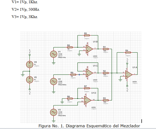 Suponga que trabaja para una compañía que diseña, prueba, fabrica y comercializa instrumentos electrónicos. Crear una solución llamada mezclador de señal con amplificador operacional, el cual permite combinar la información de varias señales provenientes de fuentes diferentes y entregar una salida a través de un único canal, un ejemplo de esto se puede apreciar al escuchar a través de un equipo de sonido las voces provenientes de varios micrófonos. Para lograr tal fin, cuentan con el amplificador operacional LM324, una fuente dual de +-9VDC y tres señales de entrada sinusoidal con los siguientes parámetros: