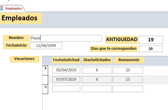 Los miembros de esta comunidad. Les comento que tengo una base de datos en access, la cual estoy trabajando para poder llevar el control de las vacaciones de los colaboradores de mi empresa, por lo que en access tengo tres tablas, 1 con la matriz de vacaciones, es decir, los días que corresponden de acuerdo a la antigüedad de cada colaborador, 1 tabla en la que se registra cada una de las solicitudes por cada colaborador y otra tabla en la que se registra el total de días que cada colaborador ha solicitado, y por medio de macros se calculan los días que les restan. Esto es de forma general la manera en la que funciona la base, y hasta el momento esto lo hago de forma "Manual", por lo que he creado un formulario dividido para el registro de las solicitudes de cada colaborador, pero mi idea es que se puedan sumar automáticamente por cada periodo los días que cada colaborador ha solicitado, para que dicha cantidad, pueda registrarse en el formulario que corresponde al total de los días que le restan por usar, sin embargo, al trasladar este formulario dividido dentro de un formulario de navegación, no me muestra los datos correspondientes a la tabla, ¿hay alguna forma en que se puedan visualizar?
