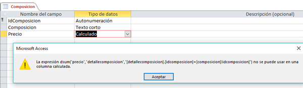 Partiendo de access 2016, es possible incluir en una tabla un campo calculado a partir de los valores de una hoja secundaria de datos como por ejemplo: