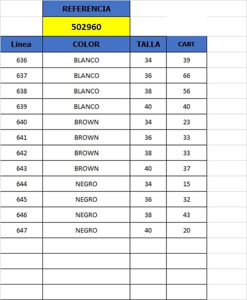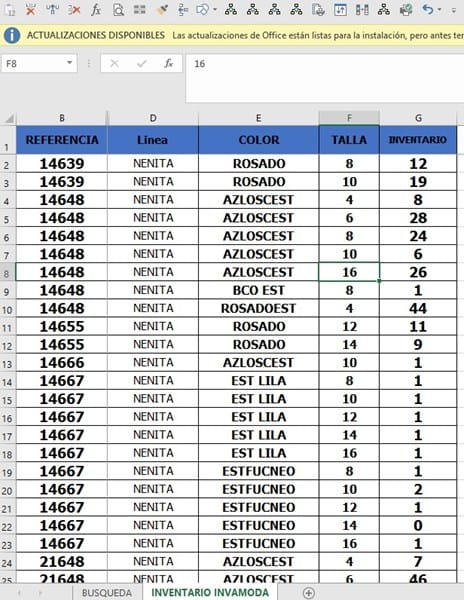 En la Hoja 2 tengo un inventario con los siguientes datos: Columna A todas las referencias, Columna B, Colores, Columna C: Tallas.