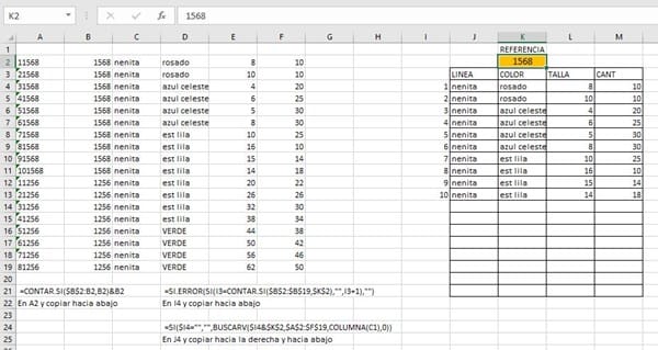 En la Hoja 1 tengo un cuadrito en el cual necesito que al escribir una referencia en la celda D2 de las que tengo en la Hoja 2 Columna A me devuelva los 12 resultados de esa referencia, es decir que en la celda D4=ROSADO, D5= BLANCO, D6= NEGRO y en las celdas E4=M, E5=S y así sucesivamente con los 12 resultados de esa referencia.