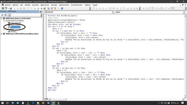 - Das doble click en Thisworkbook y se abrirá de tu lado izquierdo una pantalla en blanco, en esta copias el código completo tal y como está. Guardas el libro y lo cierras.