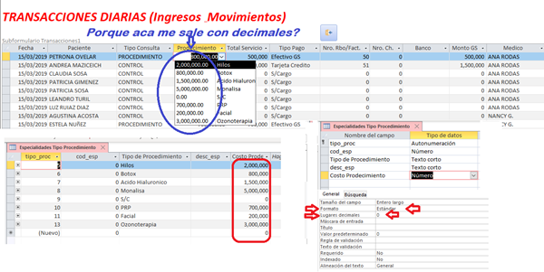 Tengo un pequeño problema que me esta complicando la existencia, ya no se que más hacer, resulta que como se ve en la imagen adjunta, en la tabla los precios están seteados sin decimales y los muestra bien, incluso en otro formulario desde donde se cargan los precios, hasta ahí todo bien, pero cuando lo traslado a las transacciones y lo pongo com desplegable junto con su info, este sale con decimales y no le encuentro la vuelta para que salga sin decimales... Alguna ayuda please...