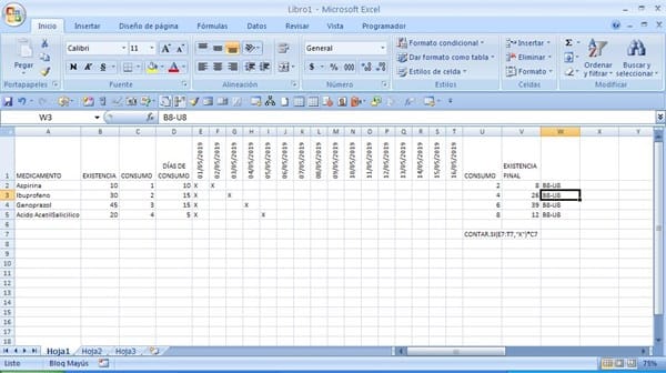 La idea sería poner en una celda las pastillas que tengo y mediante una fórmula que cada día o semana vaya restando automáticamente el número de pastillas que consumo de cada medicación.
