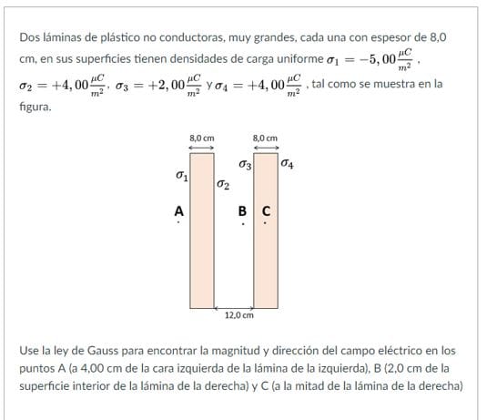 Punto A : Considera como superficie gaussiana un cilindro recto cuyas bases están una del lado de afuera de la superficie y la otra dentro del espesor de la primera lamina plástica. El flujo atravesará solamente las bases.