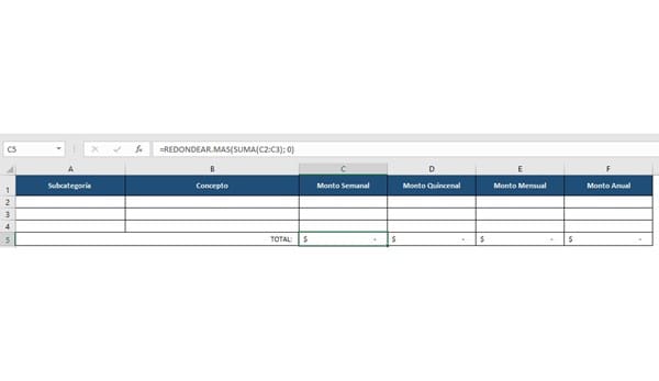 Cada categoría tiene una hoja para poner los gastos, las fórmulas solo muestran el total de la suma de cada hoja con respecto a su categoría.