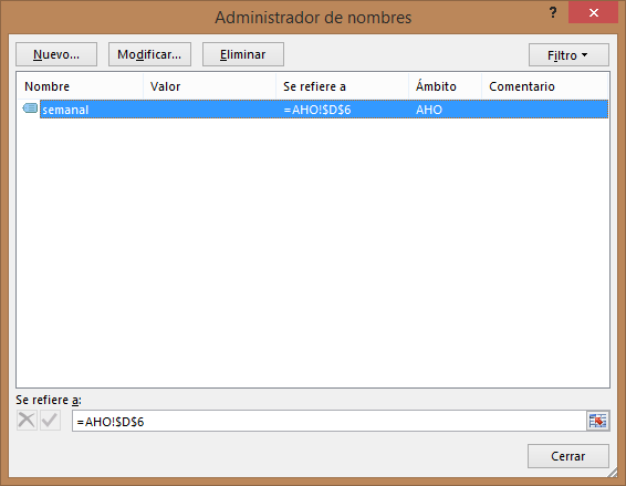 3.- En la nueva ventana emergente, en Nombre le das el nombre por el que llamarás a la celda (en el ejemplo: semanal), en ámbito debe estar el nombre de la hoja, AHO en nuestro caso (esto es importante, ya que si dejas como ábito el libro entero, no podrás utilizar el mismo nombre para un rango de otra hoja). Finalmente, te fijas que la celda a la que se refiere sea la correcta, en nuestro caso, la celda AHO!$D$6. Luego le das a aceptar.