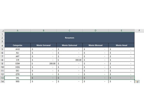 ¿Existe una forma de que la fila desde B5:E5 y todas las que están en la tabla, se vuelvan dependiente a su categoría (COLUMNA A), es decir, si muevo los "Ahorros" a la fila 7, que las celdas B5, C5, D5, E5 se muevan también?