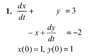 $$\begin{align}&x'+y=3\\&x'=3-y\\&x'=3-(-2 \cos t - \sin t +3)\\&x(t)= \int 2 \cos t + \sin t \ dt \\&x(t)=2 \sin t - \cos t+c\\&x(0)=1=-1+c\\&c=2\\&c(t)=2 \sin t - \cos t+2\end{align}$$