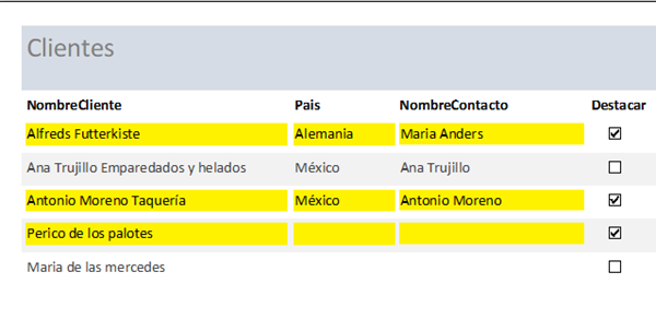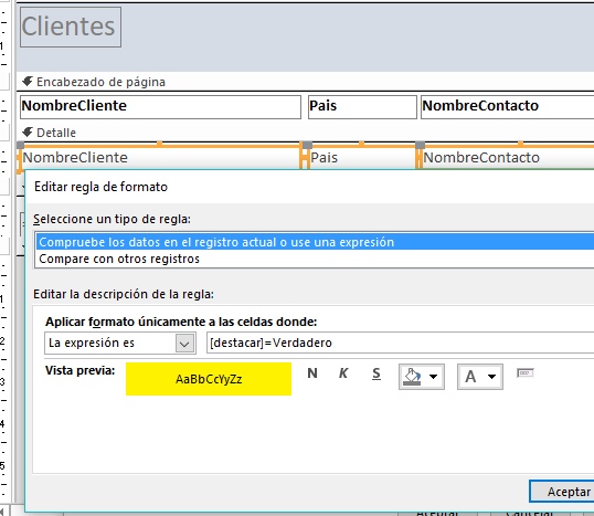 Aprovecho, para consultaros si ¿sabéis si en un informe puedo cambiar el color de fondo de todo un registro con el objetivo que destaque sobre otros? Por ejemplo: si activo un campo Sí/No que se llame DESTACAR, que cambie el color del "Detalle" en "todo el registro". No sé si me explico...