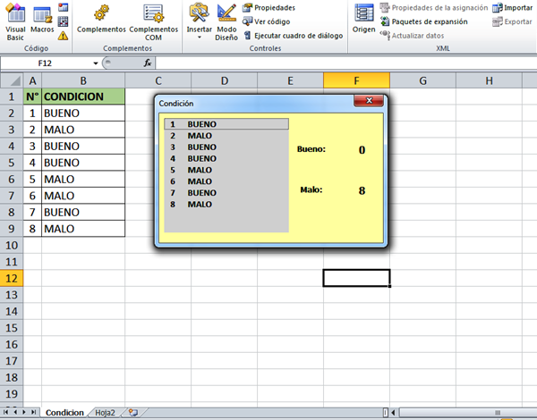 Y en dos etiquetas me muestre la cuenta por esa condición Bueno:3 y Malo:2, espero me aclaren si es posible yo solo lo he logrado con select osea seleccionando los datos en lisbox y me va contando los valores pero no así como lo quiero al momento de ir ingresando datos y se vayan cargando los datos en lisbox incremente o disminuya dichas condiciones, espero me lo puedan aclarar si se puede hacer eso con un lisbox.