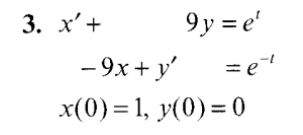 $$\begin{align}&(i)x'+9y=e^t\\&(ii)-9x+y'=e^{-t}\\&\\&(i)sX(s)-x(0)+9Y(s)=\frac{1}{s-1}\\&sX(s)-1+9Y(s)=\frac{1}{s-1}\\&(ii)-9X(s)+sY(s)-y(0)=\frac{1}{s+1}\\&-9X(s)+sY(s)-0=\frac{1}{s+1}\\&\\&\frac{9}{s}Ec_i+Ec_{ii}\\&\\&-\frac{9}{s}+(\frac{81+s^2}{s})Y(s)=\frac{9}{s(s-1)}+\frac{1}{s+1}\\&(\frac{81+s^2}{s})Y(s)=\frac{9}{s(s-1)}+\frac{1}{s+1}+\frac{9}{s}\\&(81+s^2)Y(s)=\frac{9}{s-1}+\frac{s}{s+1}+9\\&(81+s^2)Y(s)=\frac{9s+9+s^2-s+9s^2-9}{(s+1)(s-1)}\\&(81+s^2)Y(s)=\frac{10s^2+8s}{(s+1)(s-1)}\\&Y(s)=\frac{10s^2+8s}{(s+1)(s-1)(81+s^2)}\\&fracciones \ parciales\\&Y(s)=\frac{405-4s}{41\left(s^2+81\right)}+\frac{9}{82\left(s-1\right)}-\frac{1}{82\left(s+1\right)}\\&Y(s)=\frac{45}{41}\frac{9}{(s^2+81)}-\frac{4}{45}\frac{s}{s^2+81}+\frac{9}{82}\frac{1}{s-1}-\frac{1}{82}\frac{1}{s+1}\\&y(t)=\frac{45}{41} \sin 9t-\frac{4}{45}\cos 9t+\frac{9}{82}e^t-\frac{1}{82}e^{-t}\\&\\&Sustituyendo \ en \ 1\\&x'+\frac{405}{41} \sin 9t-\frac{4}{5}\cos 9t+\frac{81}{82}e^t-\frac{9}{82}e^{-t}=e^t\\&x'=-\frac{405}{41} \sin 9t+\frac{4}{5}\cos 9t+\frac{1}{82}e^t+\frac{9}{82}e^{-t}\\&x=\int -\frac{405}{41} \sin 9t+\frac{4}{5}\cos 9t+\frac{1}{82}e^t+\frac{9}{82}e^{-t} \, dt\\&x(t)=\frac{65}{369}\cos 9t+\frac{4}{45} \sin 9t+\frac{1}{82}e^t-\frac{9}{82}e^{-t}+C\\&x(0)=1=\frac{65}{369}+\frac{1}{82}-\frac{9}{82}+C\\&C=\frac{340}{369}\\&x(t)=\frac{65}{369}\cos 9t+\frac{4}{45} \sin 9t+\frac{1}{82}e^t-\frac{9}{82}e^{-t}+\frac{340}{369}\\&\end{align}$$Las fracciones parciales si quieres revisala tu, yo busqué el resultado en internet porque es muy tedioso y no es el punto de la pregunta