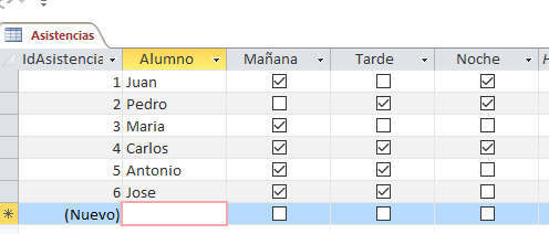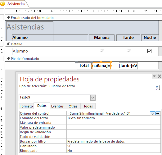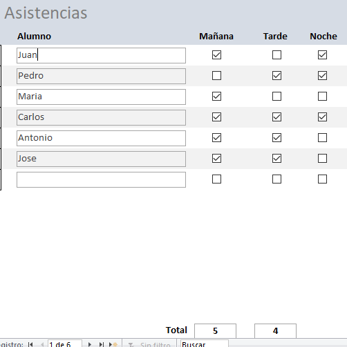 Llevo tiempo probando pero no hay manera. Tengo una tabla que recoge la Id del alumno y luego varios periodos de inscripción ( que se marcan con casillas de verificación) y otros para días sueltos ( campo texto). El tema es el siguiente. En la misma tabla o consulta puedo darle a totales y me cuenta las casilla en la fila totales de abajo. El