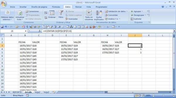Si le pido a Excel que me cuente en la tabla los días en los que el valor es Q18 me da como resultado el número siete cuando en realidad los días en que aparece ese valor son tres: