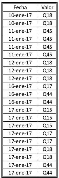 Como se puede ver, como ejemplo, el valor Q18 se repite dos veces para la fecha 17-ene-17 o lo que es lo mismo la fecha se repite dos veces para ese valor.