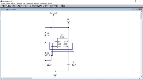 Guiándome en internet acerca de cómo realizar un temporizador mediante un circuito astable 555, como este:
