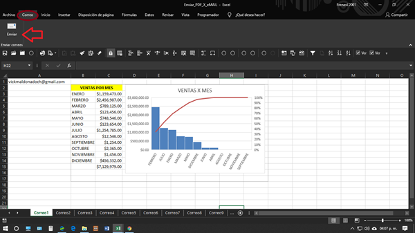 Tengo un libro con 15 hojas con gráficos. Cada hoja quiero que se envíe a la dirección de correo que aparece en la celda a1 de cada una. Me gustaría que se envié en formato pdf y en el asunto del mensaje ponga:"gráficos del trimestre actual".