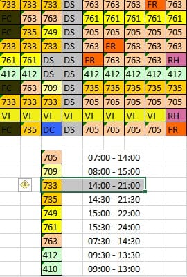 Tengo una herramienta de horarios que me exporta el horario, pero no en formato correcto. Es decir. La herramienta a cada horario es un número. Por ejemplo, el numero 705 corresponde al horario de 07:00 - 14:00. El numero 733 corresponde al horario de 14:00 - 21:00. El programa me exporta el Excel y me sale el nombre de la persona, y a la derecha los números.