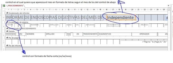 En el origen del control, según lo compartido por eperezfer, se introduce lo siguiente: =nombredelmes(Falso;1;Fecha()) donde falso o verdadero determinan si uno quiere que el formato del mes salga completo o solo las 3 primeras letras del mismo (ABRIL o ABR). El siguiente numero (puede ser 1, 2 o 3 según el código), formatea los caracteres en MAYÚSCULAS, MINÚSCULAS o solo la primera letra del mes en mayúscula. Ahora bien, la tercera parte del lo escrito en el origen del control (Fecha()) lo que hace es introducir el mes en curso según la fecha del sistema. Justamente aquí es donde yo necesitaba que el mes no fuese el actual del sistema si no que me introduzca el mes del informe generado. Es por eso que cambie la parte de Fecha() por el campo del informe que posee las fechas de los procedimientos (mi campo se llama F_procedimiento), por lo que en el origen del control del txtbox que use le puse =nombredelmes(Falso;1;[F_PROCEDIMIENTO]) en ves de =nombredelmes(Falso;1;Fecha()), obteniendo así como resultado que en el titulo del informe que se genera, tome la fecha de los controles del informe f_procedimiento y entonces aparezca como titulo el mes en formato letra correspondiente al mes de los procedimientos realizados según el informe generado.