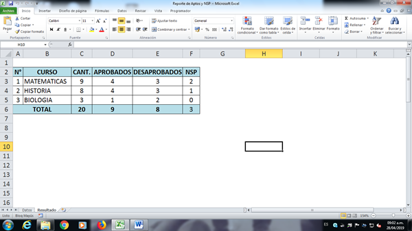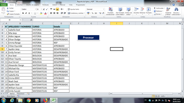 Y esta otra hoja "Resultado", es donde debe aparecerme los datos procesados al momento de darle click al boto procesar en la hoja Datos.