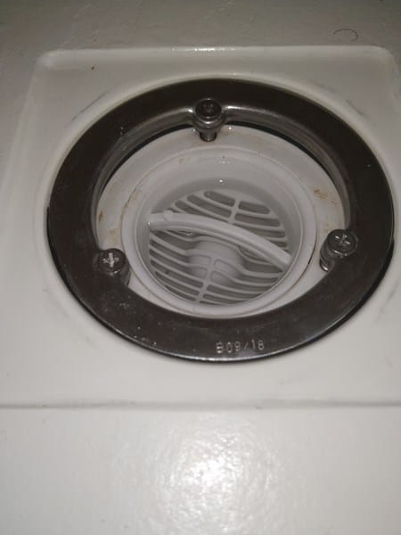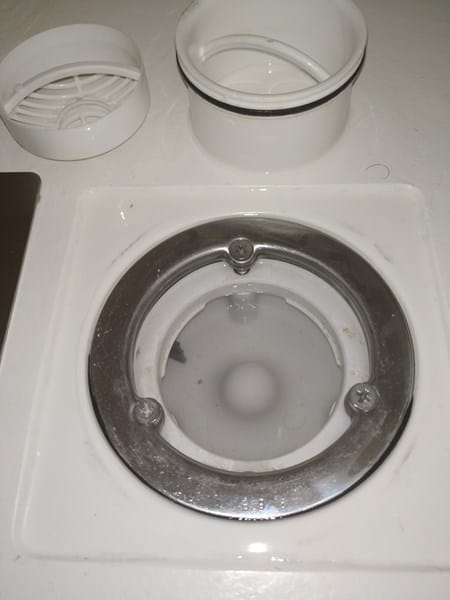 Como podéis ver, el agujero por donde se va el agua en realidad son unas rendijas estrechas de uno o dos centímetros de alto, en la parte superior, que no se ven en la foto. No hay ningún agujero grande, no sé si esto suele ser así. Y se puede ver también una pieza negra que parece un tapón, y que imagino sirve para retener pelos y objetos que puedan caer.