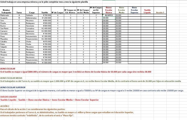 BONO ESCOLARSi el Sueldo es mayor o igual $800.000 y el número de cargas es mayor que 3 recibirá un Bono de Escolar Básica de 50.000 por cada carga sino recibirá 38.000BONO ESCOLAR MEDIASi el trabajador es del Turno A, su sueldo es mayor que 2.000.000 y el Nº de cargas es 0, no recibe Bono Escolar Media, de lo contrario el bono será de 26.000 por hijos en educación mediaBONO ESCOLAR SUPERIOREl Bono Escolar Superior se otorgará de la siguiente manera, si el sueldo es menor o igual a 700000 y su Nº de cargas es mayor o igual a 5 recibe 230000 en caso contrario solo recibe 150000 por carga. SUELDO LIQUIDOSueldo Liquido : Sueldo + Bono escolar Básica + bono Escolar Media + Bono Escolar SuperiorACCIÓN 1Para el cálculo de la acción 1 se consideraran los siguientes puntos: Si el trabajador pertenece al Turno A, es Administrativo, su Sueldo es mayor a 1 millón y tiene cargas que estudian en Educación Superior, entonces tendrá contrato "Indefinido", de lo contrario el será a "Plazo Fijo".
