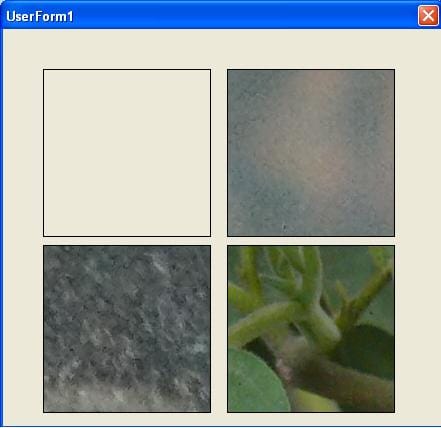 Según recuerdo te mencione que programar VBE no es nada fácil y tampoco es común su uso, casi no conozco a nadie que programe como tu lo estas pidiendo y mis conocimientos sobre el tema son muy limitados puesto que yo no veo la utilidad de programar así, dicho esto la solución a lo que planteas es la siguiente, en el formulario al que llamare userform1 hay una cuadro de imagen sin imagen