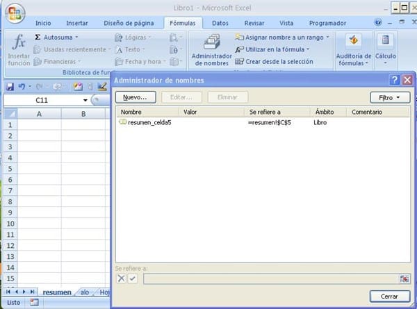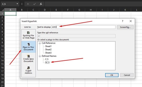 En mi libro, en la hoja Resumen, la celda A5 le puse como nombre C.5, lo que quiero es que de otra hoja llamada AHO, al darle click me mande a esa celda, pero tomando como referencia el nombre "C.5" y no "A5". Lo mismo quiero hacer desde la otra celda a la anteriormente mencionada, la otra celda de la otra hoja es la A1, le puse como nombre SC.5, quiero hacer un hipervínculo tomando como referencia los nombres que le cambie a ambas (C.5 y SC.5).