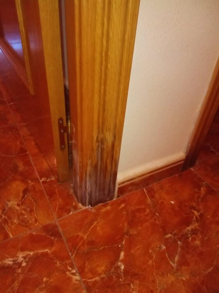 Una inquilina nos ha dejado así todos los marcos de las puertas, porque su perro se ha meado en todas ellas, especialmente en la de la cocina, que está muy hinchada y eso impide que se pueda cerrar la puerta. Mi pregunta es: ¿Qué tipo de arreglo tiene, tanto las que solo están manchadas, como la que está hinchada?