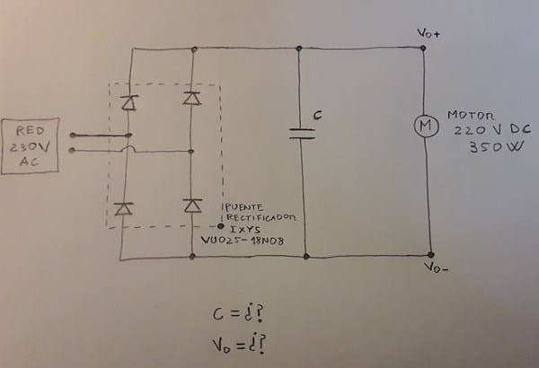 Consiste en alimentar desde el enchufe de la Red Eléctrica AC, un puente rectificador para que me transforme de alterna a continua. Luego un condensador C para que filtre y estabilice y reduzca rizado en la señal dc. Y por último ya alimentar el motor.