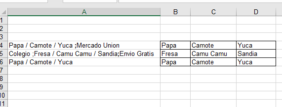 Tengo un Archivo con muchos datos, ando buscando un código que me permite extraer una pequeña parte de un palabra en las celdas contiguas, Los datos tienen diferentes formas pero llevan un patrón único aveces inicia con un texto luego continua un punto y coma ( ; ) para luego presentarse el la frase terminando en el siguiente punto y coma ( ; ) claro aveces no ay puntos y comas puede ser al inicio o final lo que me gustaría es que se extraiga la frase en 3 celdas como se muestra en la imagen tomando como referencia o separador los slas ( / ) siempre van 3 palabras separadas por 2 ( / )