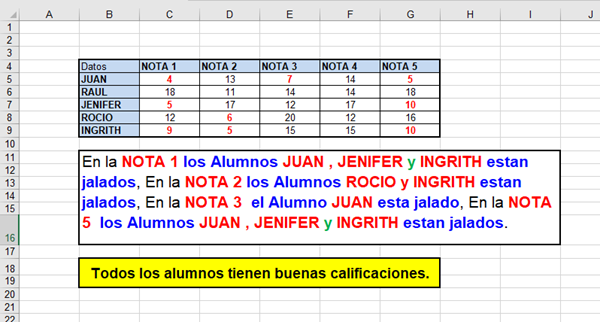 Lo de color rojo son sus respectivos encabezados de fila superior y columna izquierda, lo de azul varia si es plural o singular nada más y lo verde solo es para cerrar el plural, claro obviamente la celda debe tener ese texto pero todo de color negro los colores se dio como referencia. Y la celda de amarillo es solo si no hay valores de color rojo pero obvio en la misma celda B11 DONDE SE REFLEJARA EL TEXTO QUE CORRESPONDE ANIDADO.