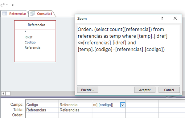Creo una consulta como la de la imagen, para que me diga cuantas veces se repite un código y le añado un campo Orden, que por un lado me va a decir lo anterior y me servirá luego para el código