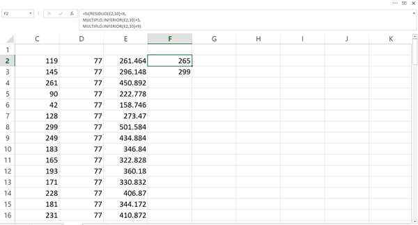 296.148 residuo = 6.148 <6, no cumple condición, redondea a 299, etc. Hasta el final de la hoja con datos.