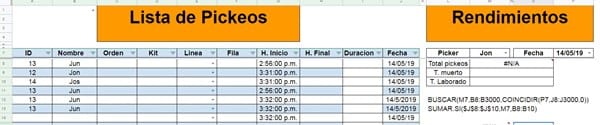 A la derecho en "rendimientos" donde dice "Picker" la lista desplegable se basa en los nombres de la celda B2, lo que quisiera es poder "filtrar" por fecha cuantas veces aparece un nombre, por ejemplo en P7 esta la fecha, esta se basa en la lista desplegable de las fechas puestas en J7 en adelante, lo que quiero es poder elegir el nombre de la persona, y la fecha, y en M8 la celda al lado de "Total de pickeos" me diga cuantas veces estuvo X persona en una fecha.